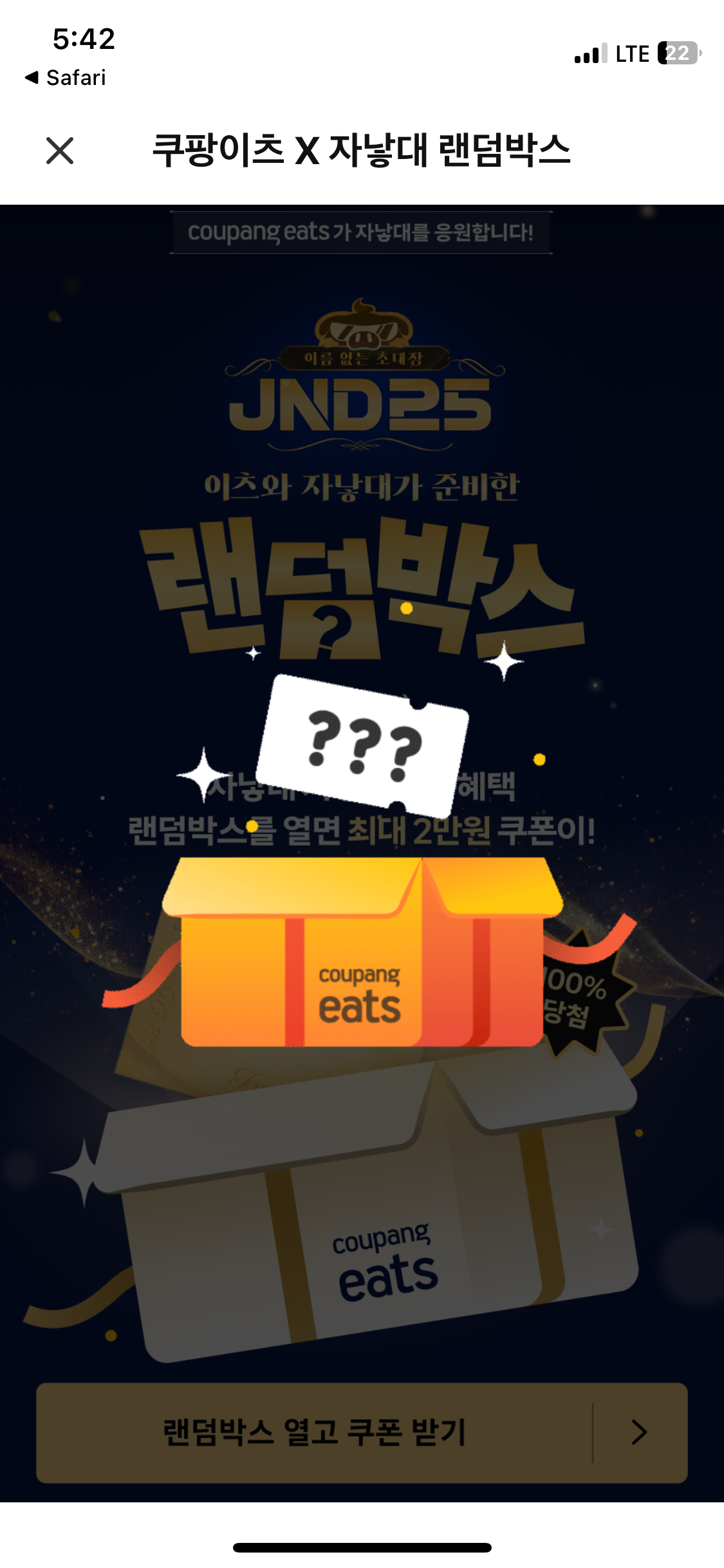 위 사진을 클릭 후 ‘랜덤박스 열고 쿠폰 받기’ 클릭 하고 조건 충족 시 앱 내 쿠폰함에 바로 들어와 있음.